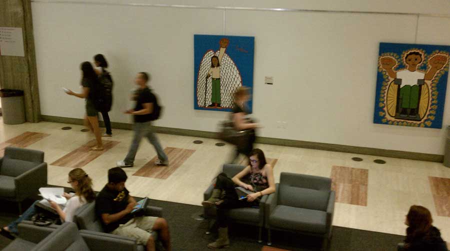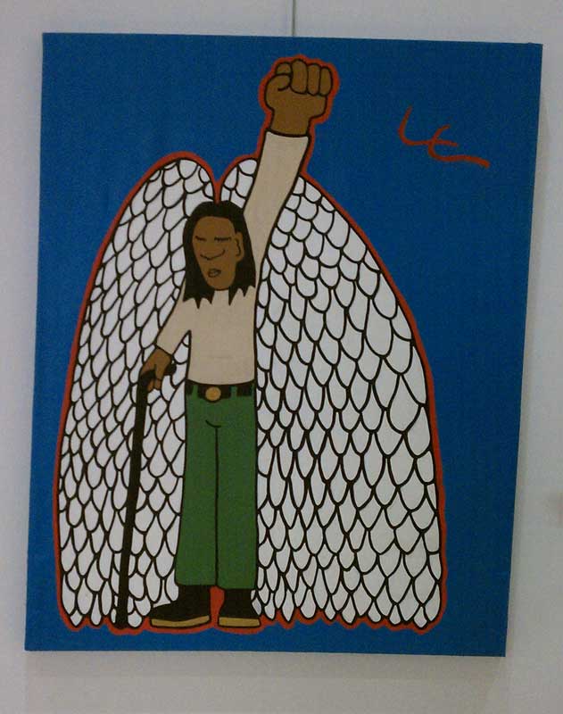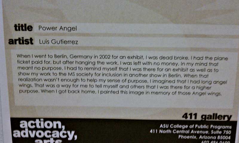 The artist’s Power Angel caught my eye in a building on the ASU campus. I love the blue background, the powerful fist thrust into the air, the wings. It wasn’t until I’d read Luis’s story about feeling a little lost in Germany that I noticed the Power Angel walks with a cane.