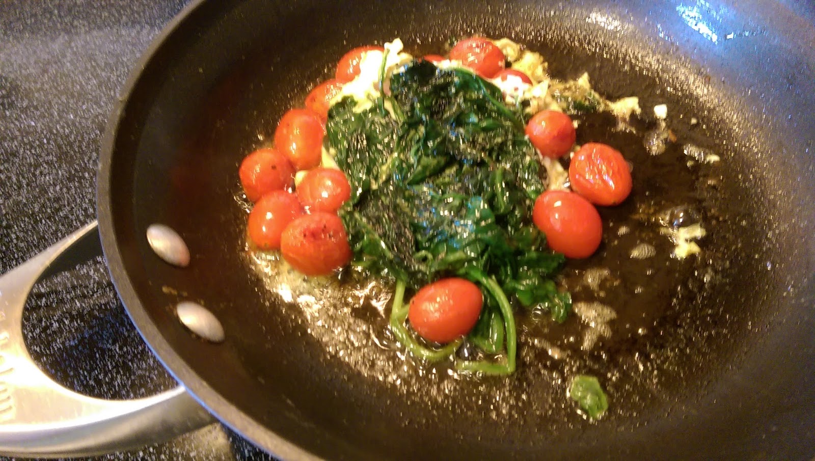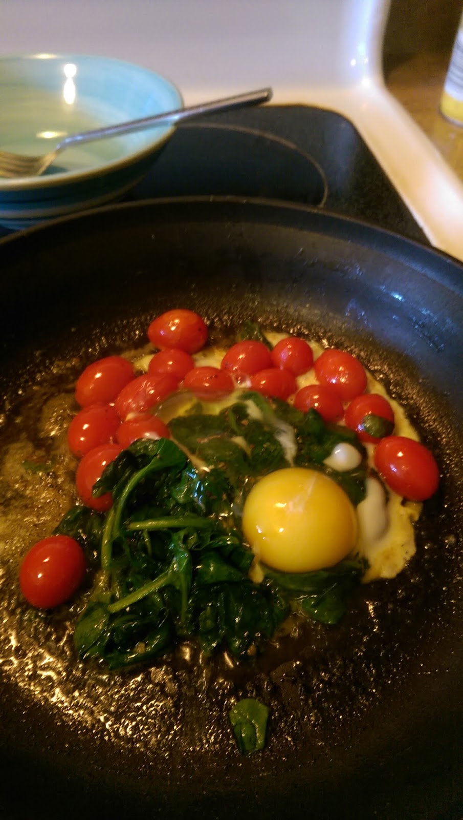 When the tomatoes started to soften, I broke an egg on top, turned down the heat and let it cook. I flipped the whole thing over for an over easy spinach nest and served it up with coffee.